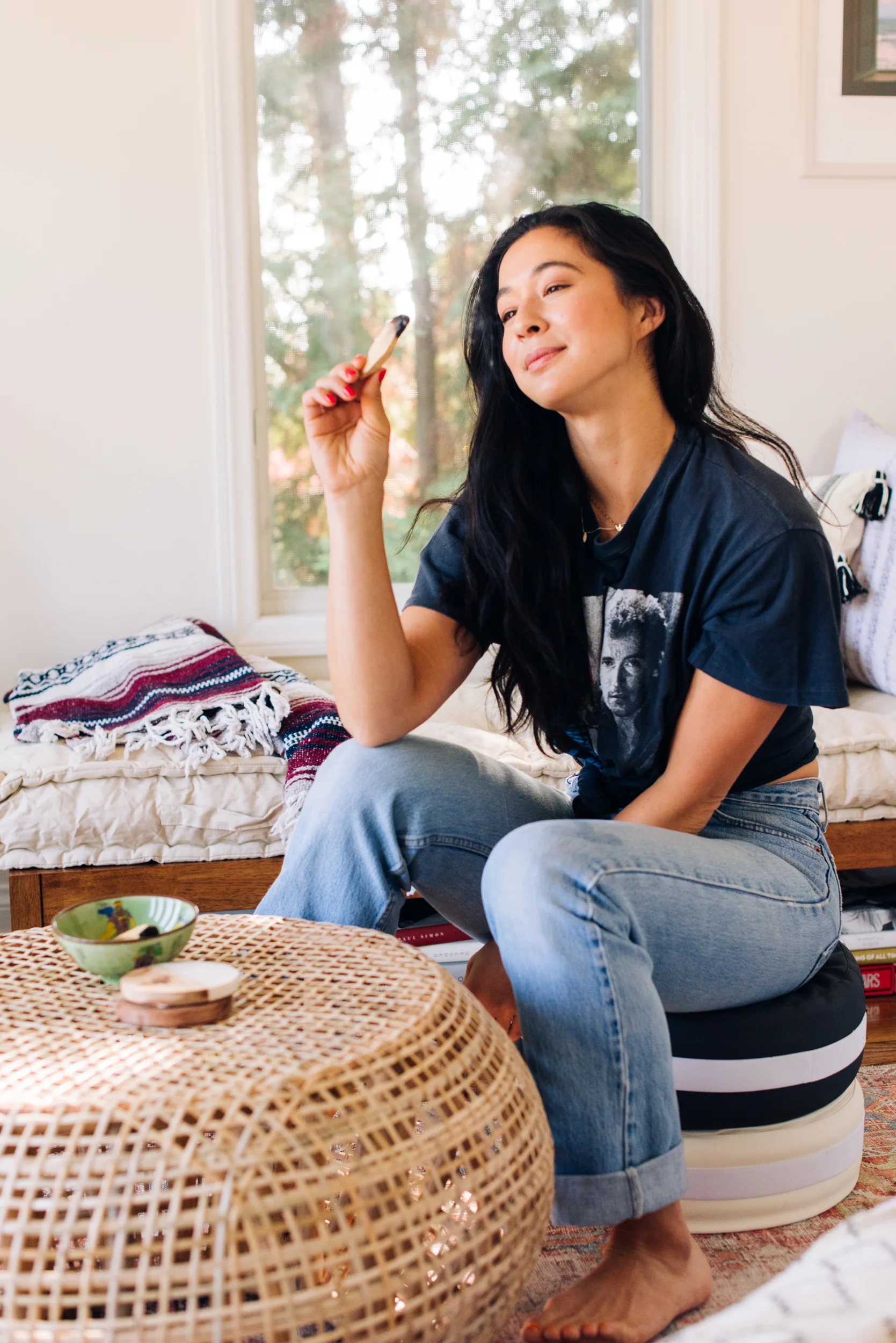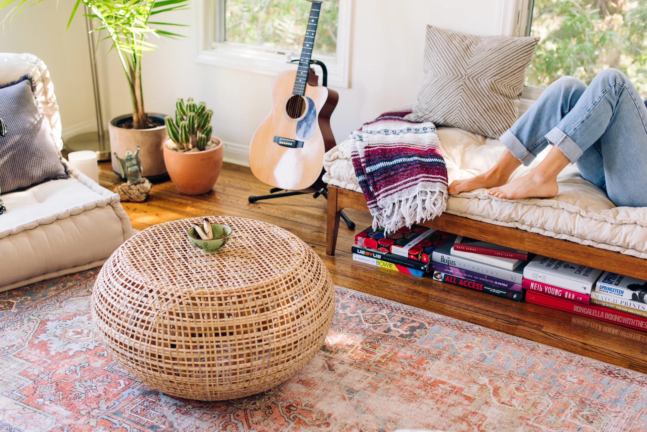 Boho, but not BOHO: While the idea of the room is the definition of bohemian, I didn’t want the space to scream BOHO. Rather than throwing any Buddha or macrame item I could find into the Zen Room, I keep the lines clean and areas open so I can roll out a yoga mat without moving any furniture. We kept everything low to the ground, covered the room with soft textiles (Ivy Fringe Throw Pillow), cool ceramics and living things (Brina Planter and Stand / Loren Leather Hanging Plant).