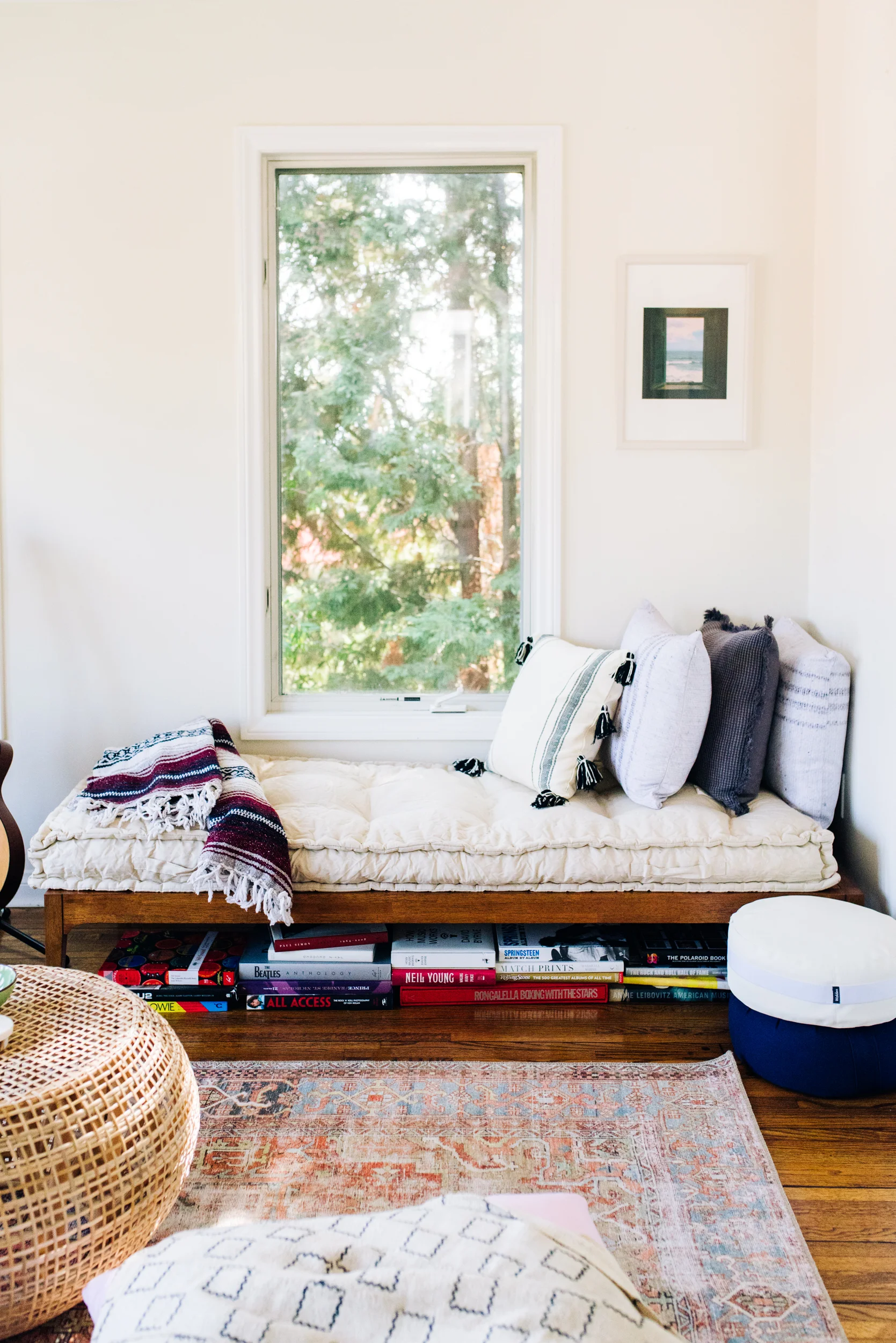 Variety of Shapes: I made sure I found furniture pieces that varied in shape to enhance the flow and add a softness to the room. A rectangular Hopper Daybed, square Reema floor cushions and a circular Marte Ottoman keep the space from looking like a puzzle. The Marte Ottoman is my favorite piece in the space. Every morning I grab coffee, my computer and pull up my Walden meditation pillow and plow through my inbox while Matt reads on the daybed. What a life.